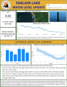 The attached report PWR-022-25 – Farlain Lake Water Levels – Pdf  was prepared by the public works department of Tiny Township in response to a deputation made by some members of the Farlain Lake community in June of 2025.  At the August meeting, Council approved staff’s recommendation to proceed with Option #3, although there was also some consideration to the need for a hydrogeological study as outlined in Option #2. The next step was for the Township to hold a public information meeting (PIC) which would include the Township Drainage Superintendent, and focus on educating the public as to how the process outlined in the report would work, including potential costs to residents.